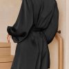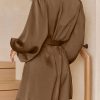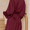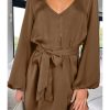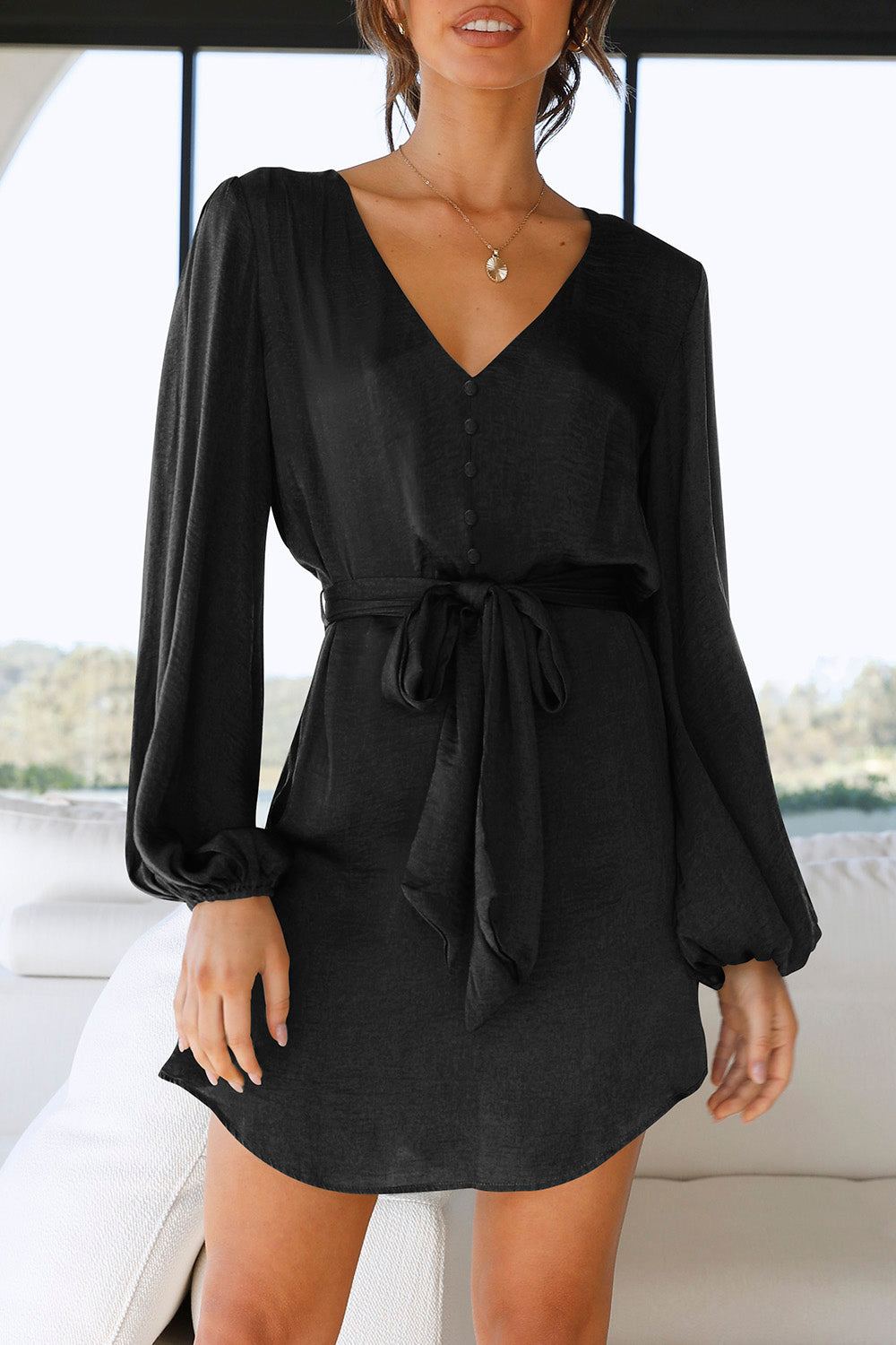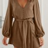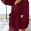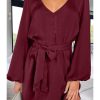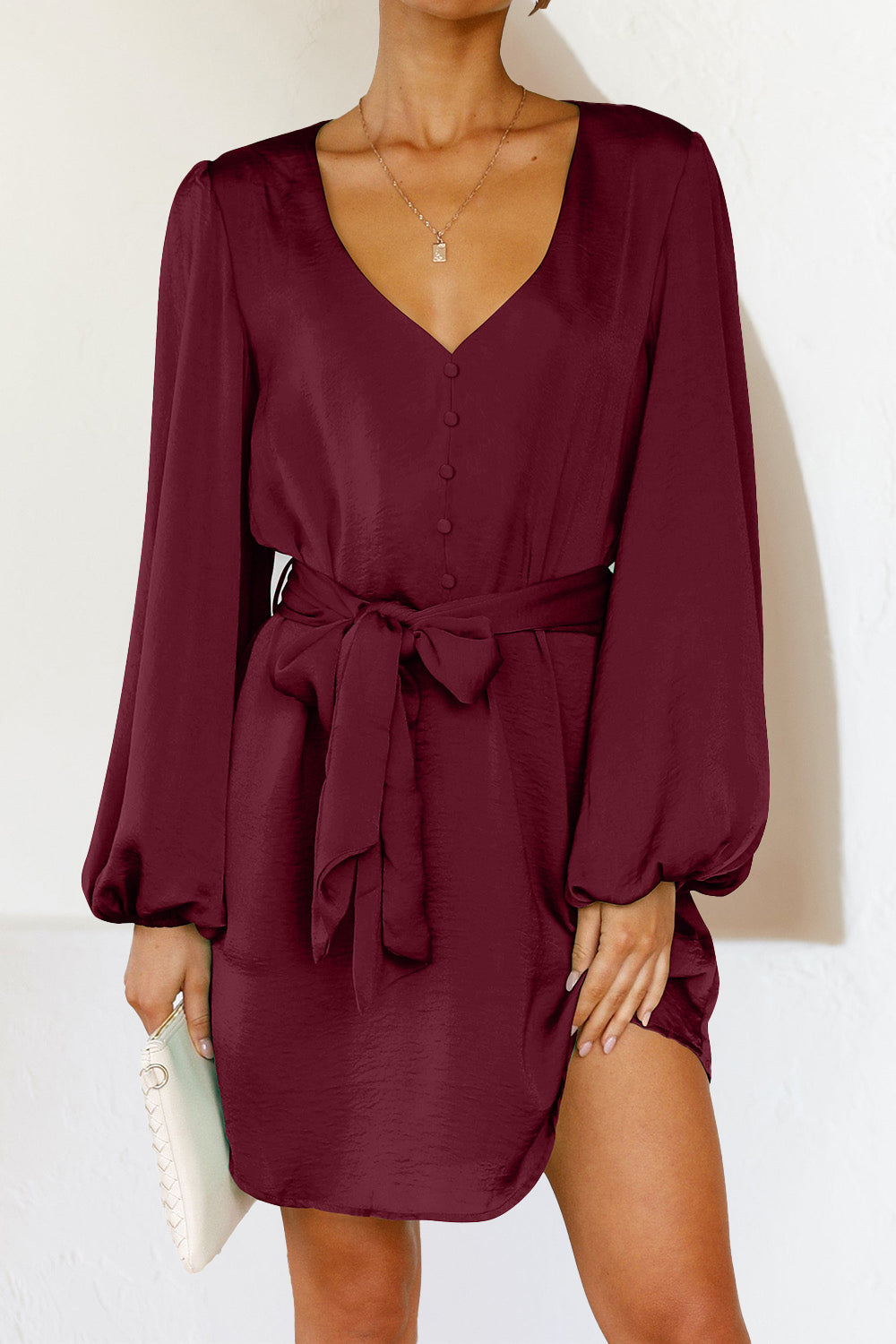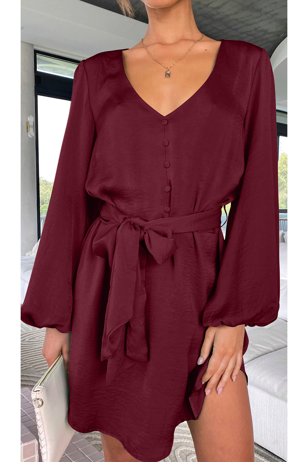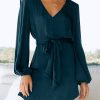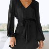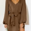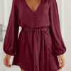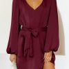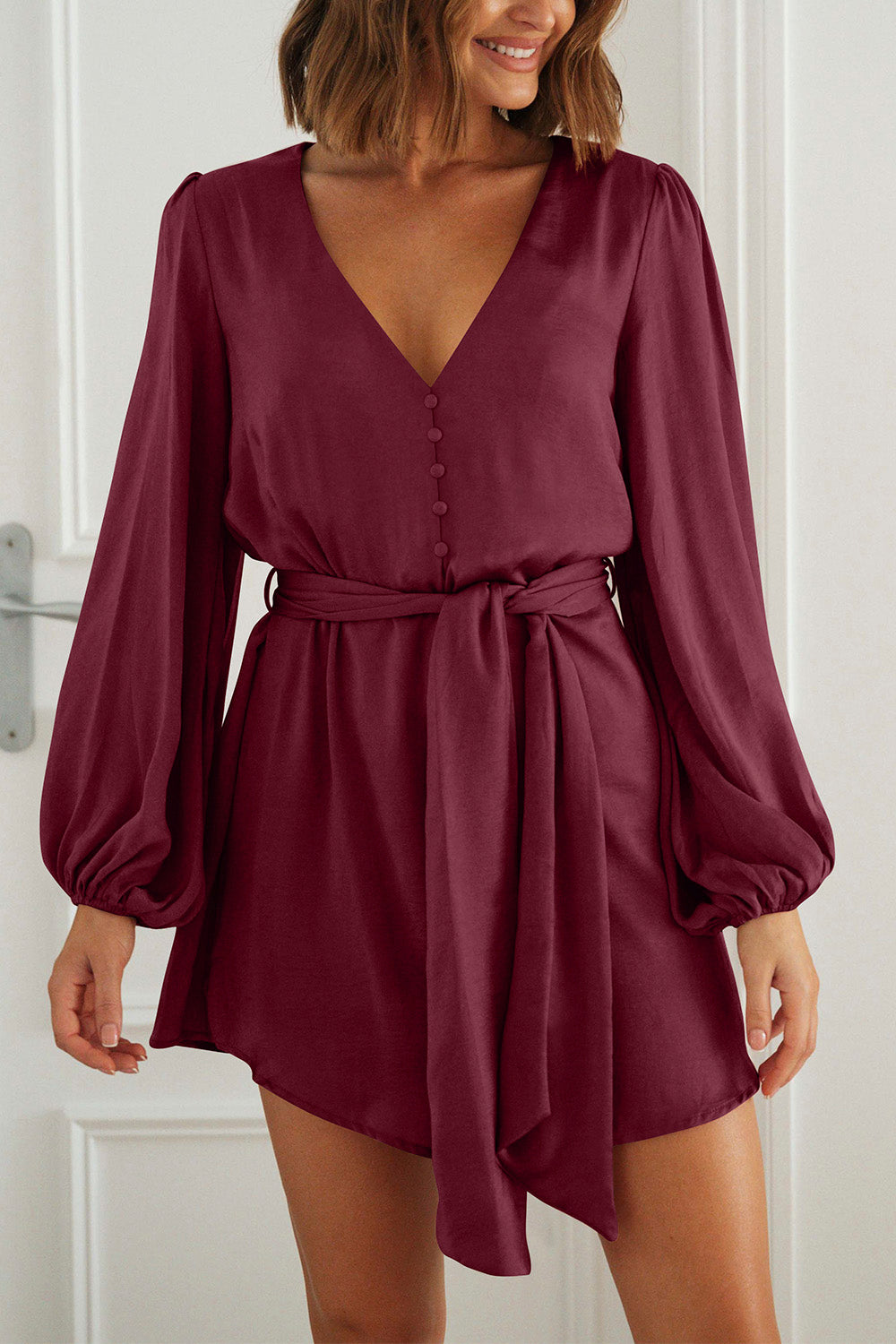 / V Neck Long Puff Sleeve Belted Short Party Dress