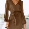 V Neck Long Puff Sleeve Belted Short Party Dress