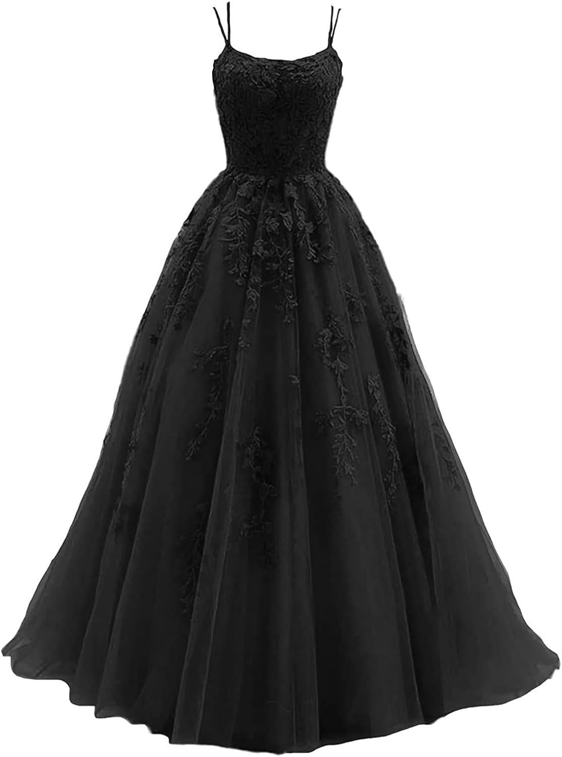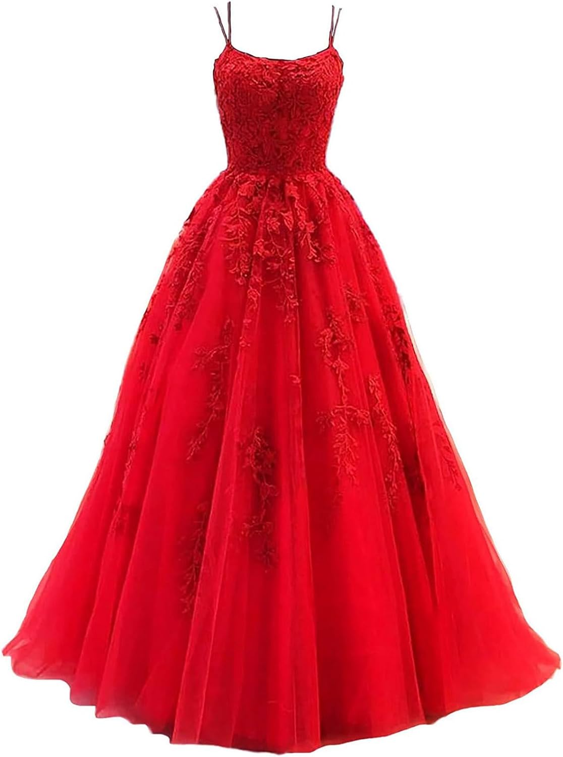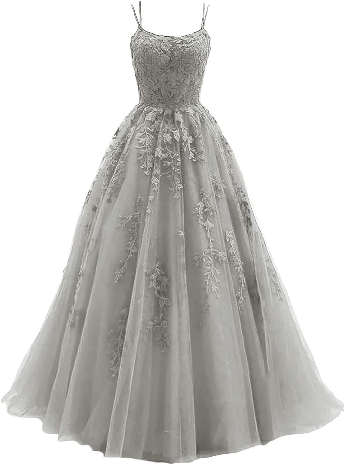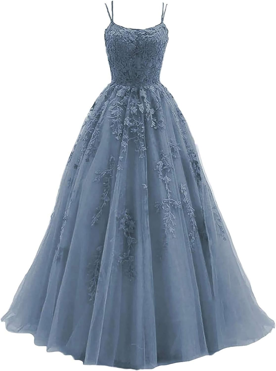 Women’s Lace Appliques Prom Dresses Long Spaghetti Strap Ball Gowns Tulle Formal Dress for Party