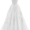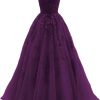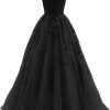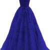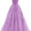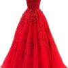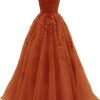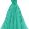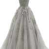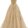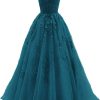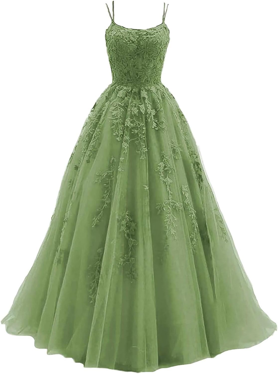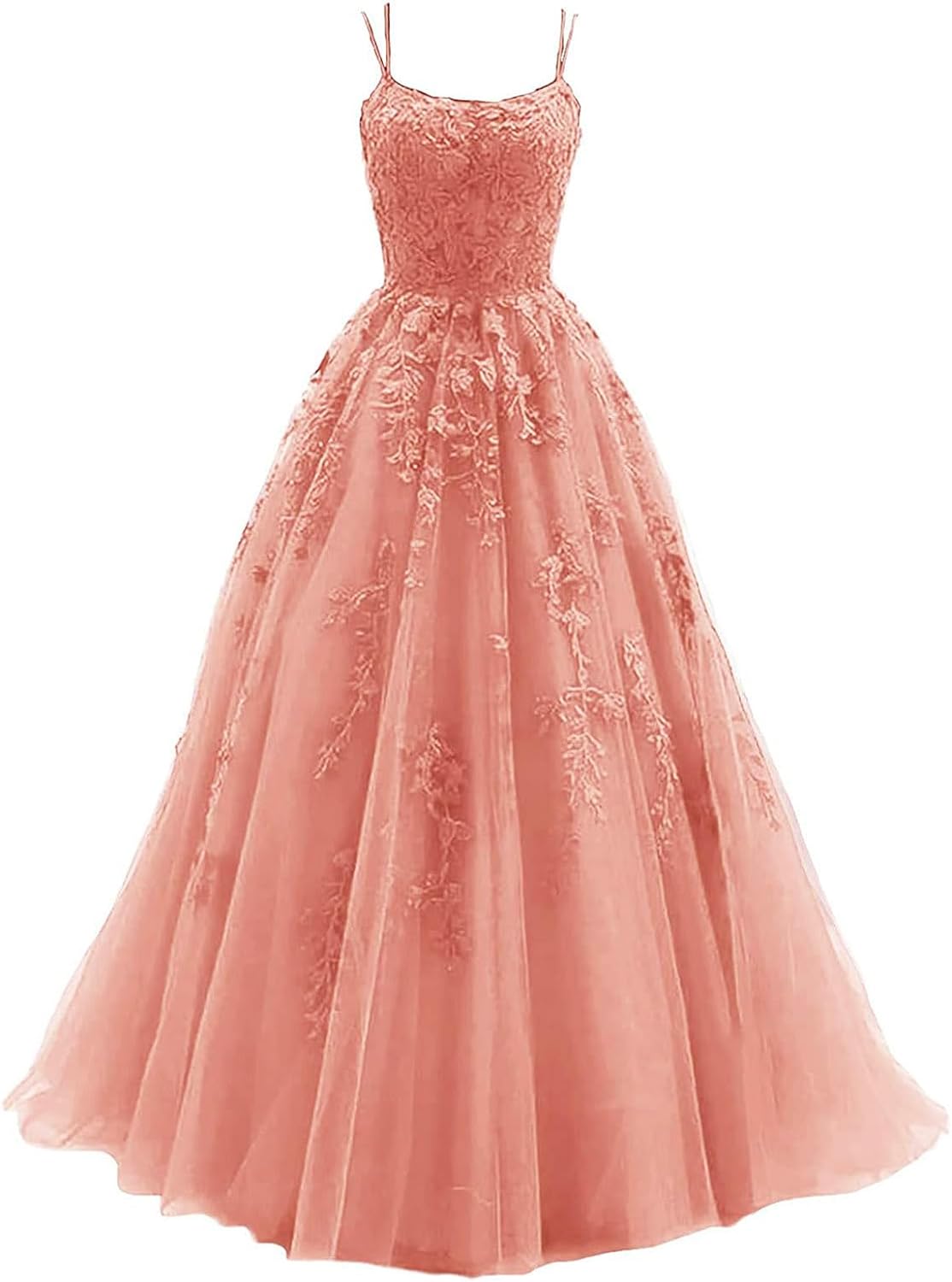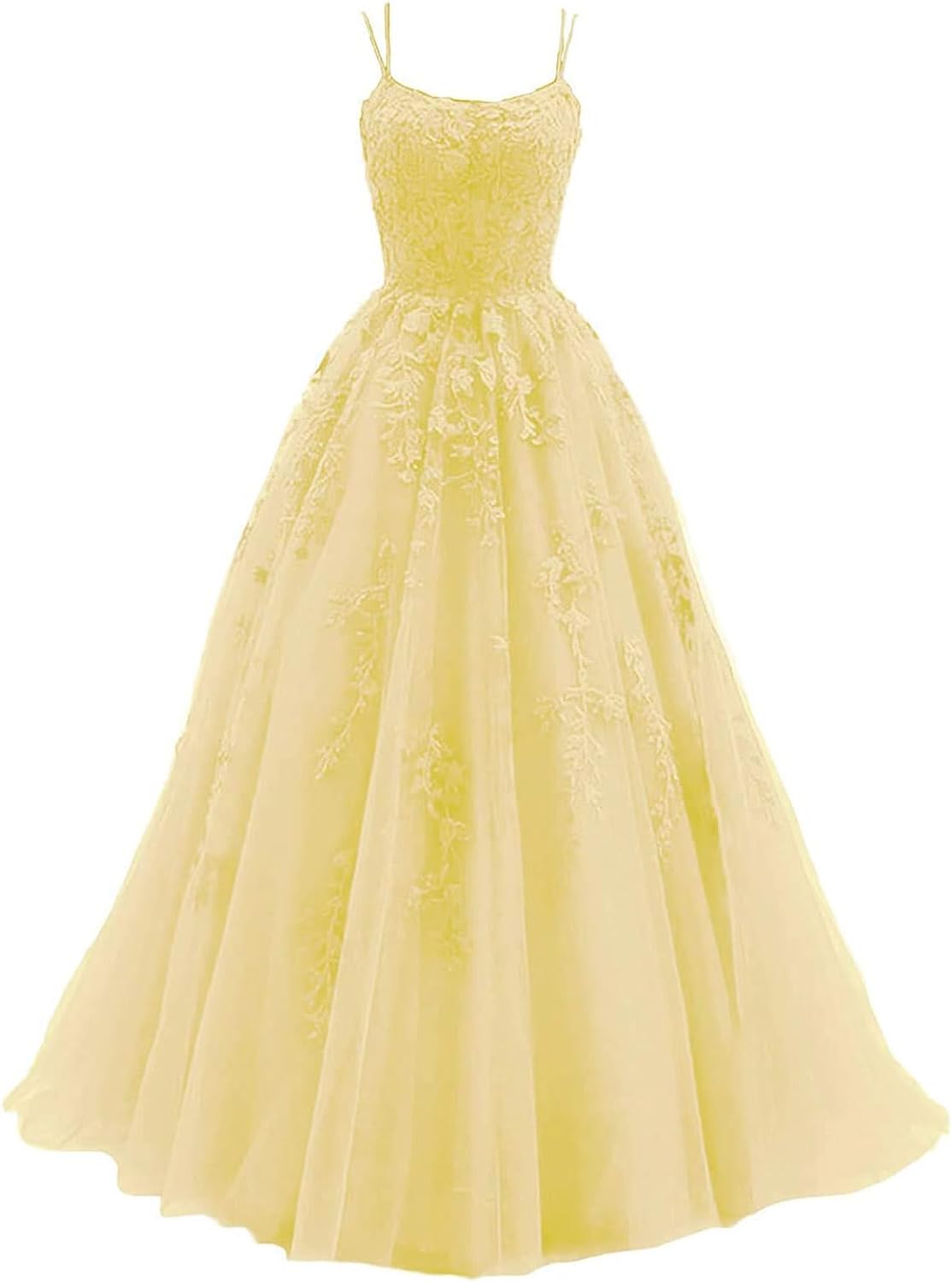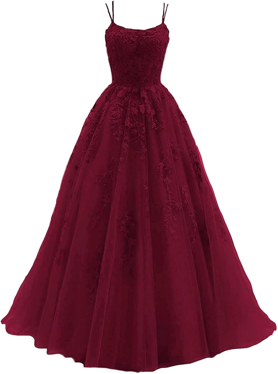 Women’s Lace Appliques Prom Dresses Long Spaghetti Strap Ball Gowns Tulle Formal Dress for Party
