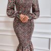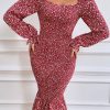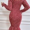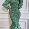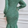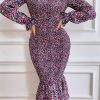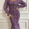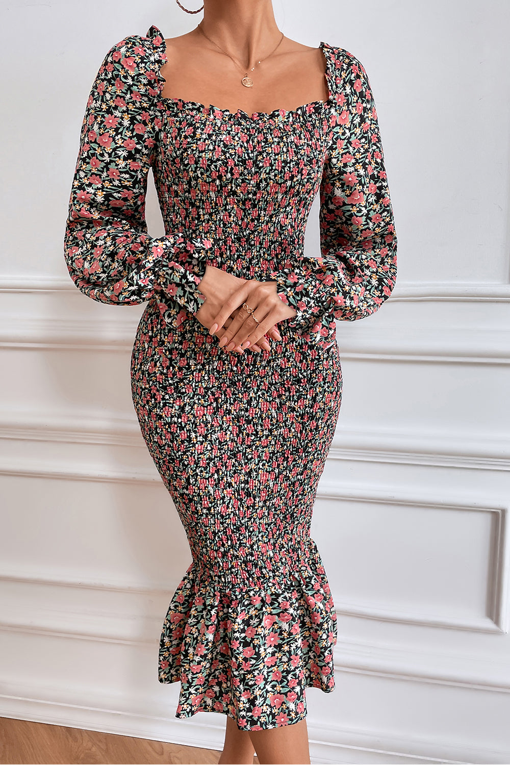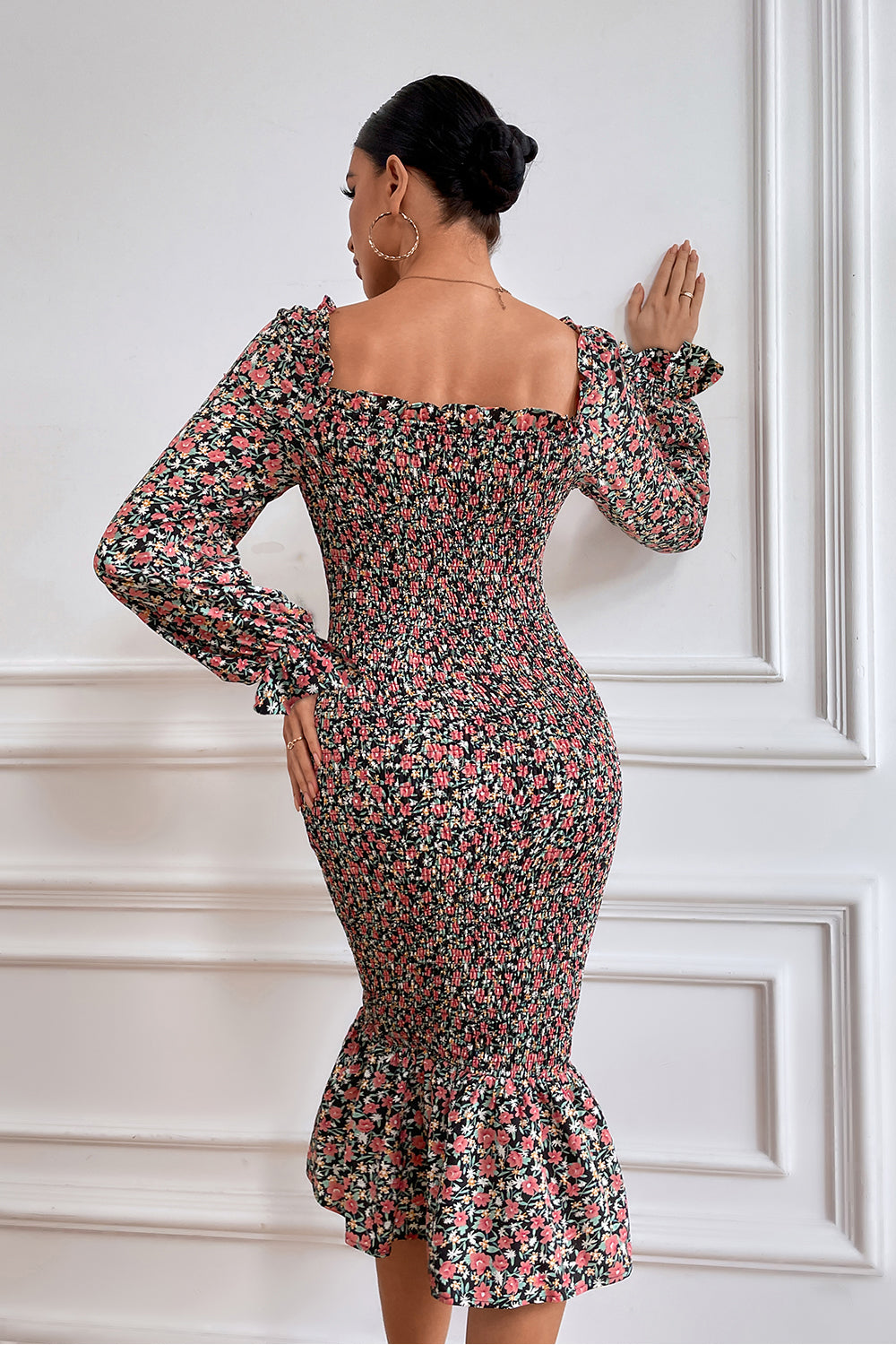 Long Puff Sleeve Floral Midi Bodycon Dress