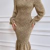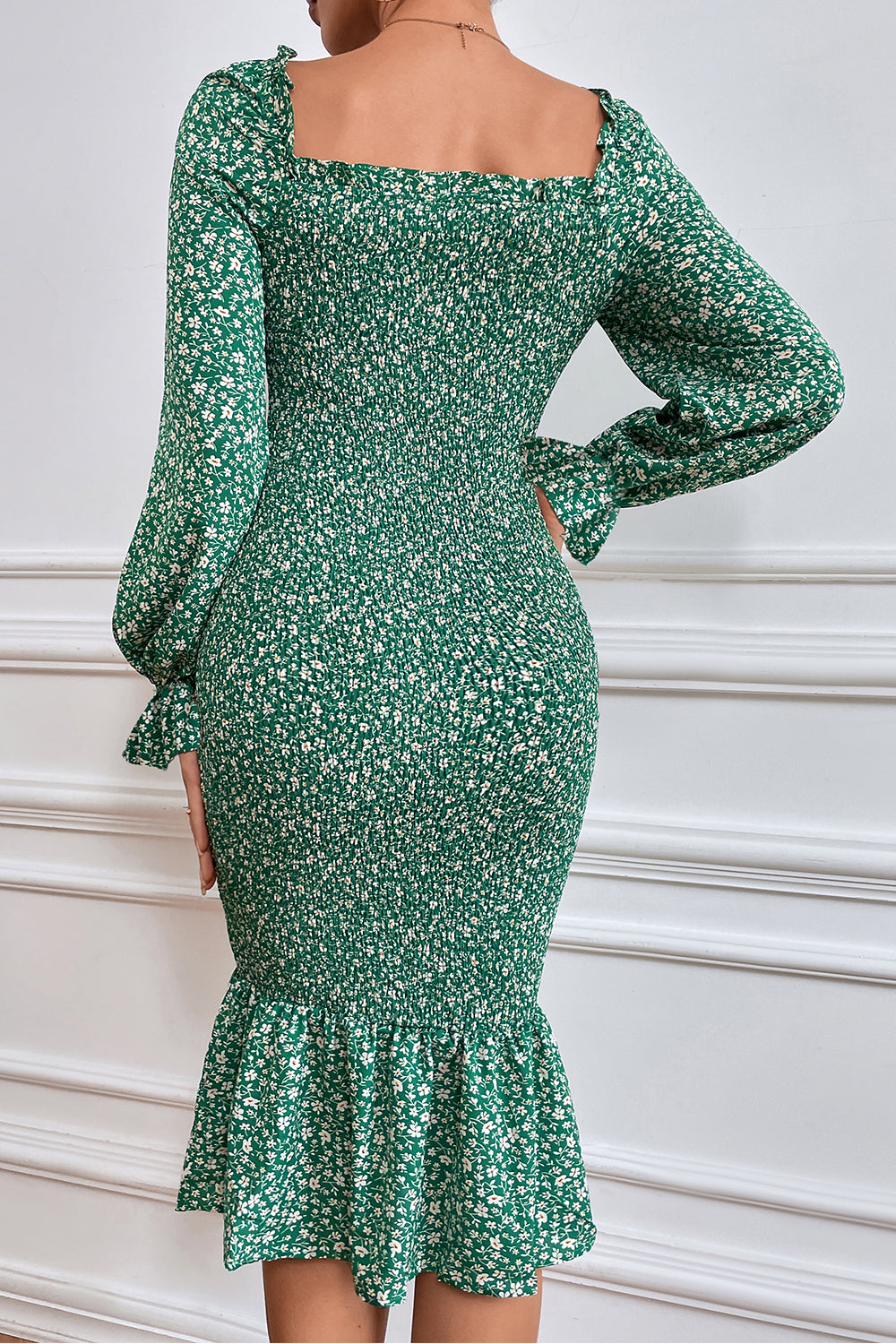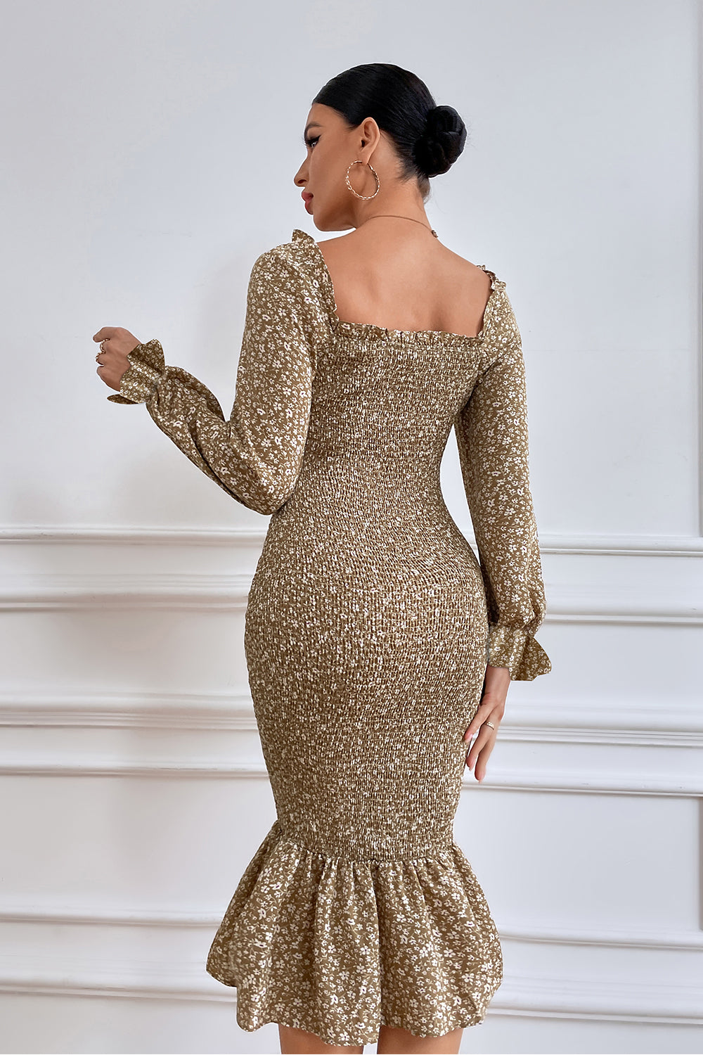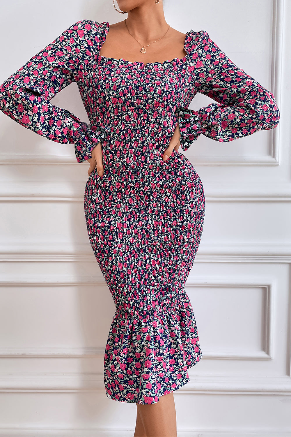 Long Puff Sleeve Floral Midi Bodycon Dress quantity