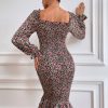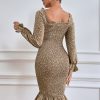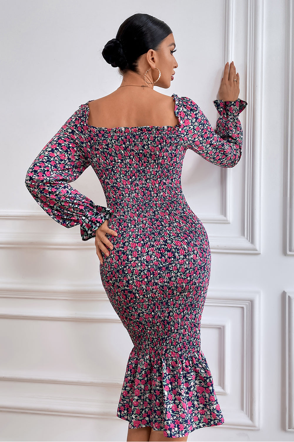/ Long Puff Sleeve Floral Midi Bodycon Dress