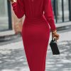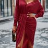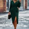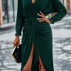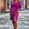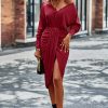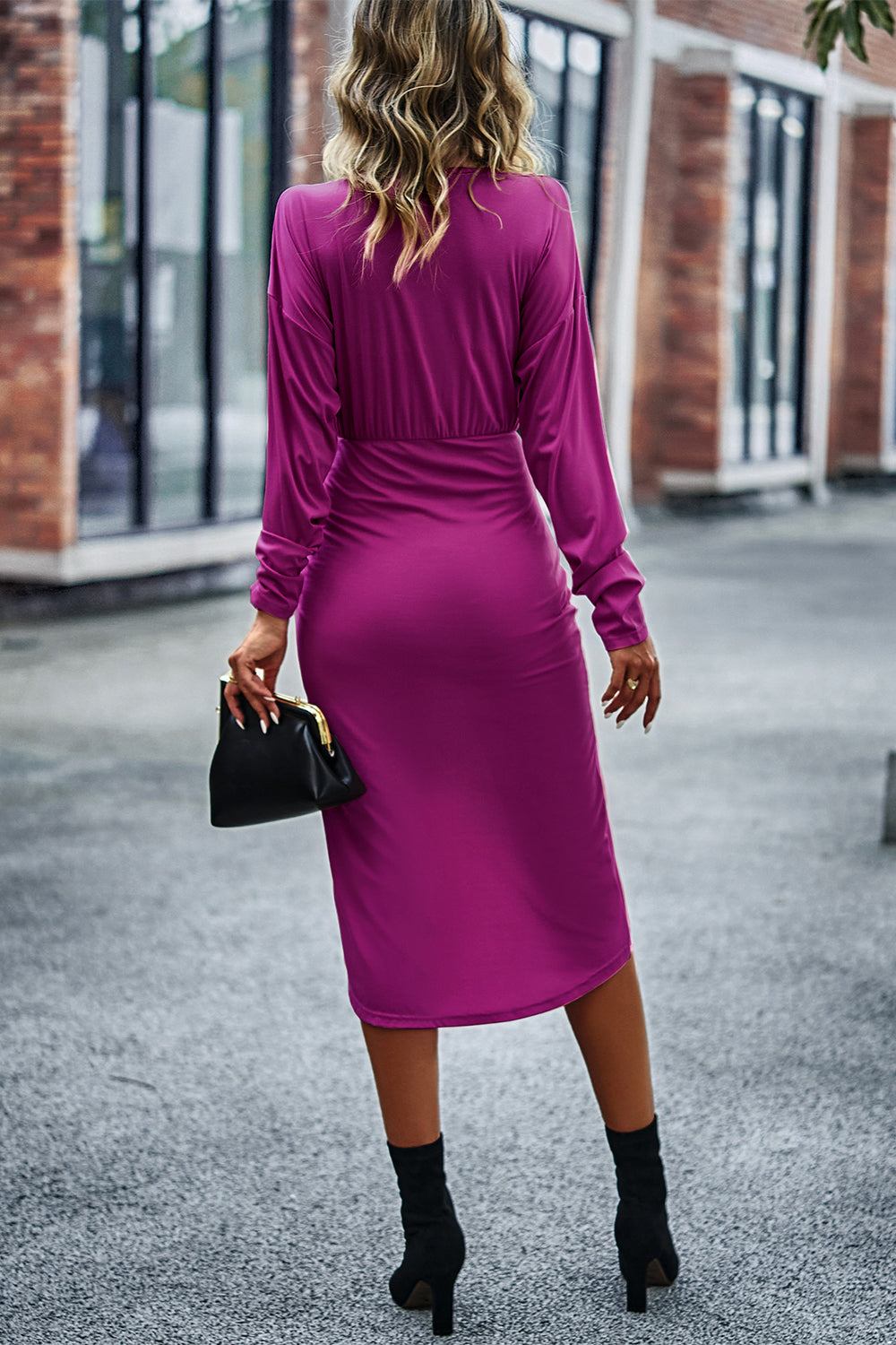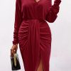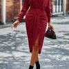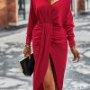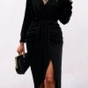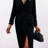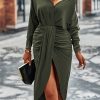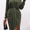 Women’s Ruched Wrap V Neck Split Hem Draped Front Bodycon Dresses